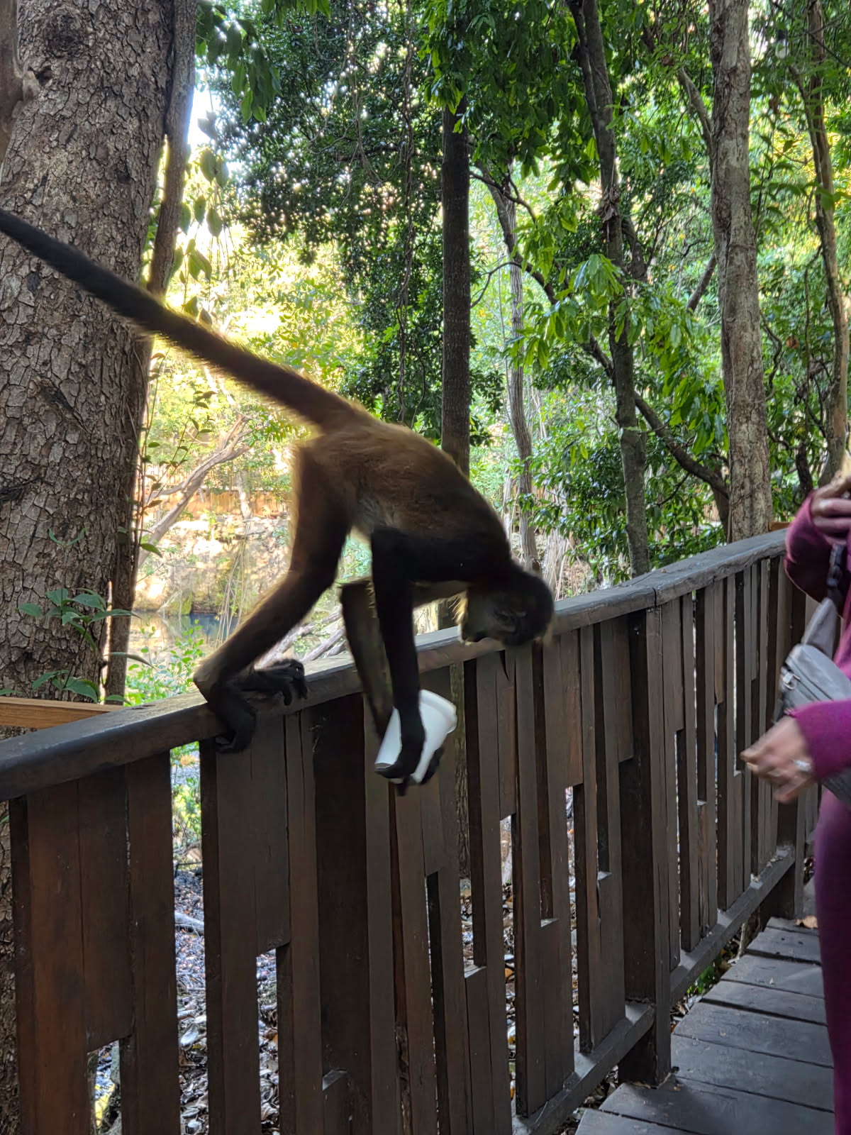 That is — until we found them on the nature trail. While trying to snap a picture, one little guy came right up to me, grabbed my coffee, and ran! ☕🐒 He didn’t drink it (thankfully) and quickly dropped it in favor of heading toward the resort’s daily fruit delivery.